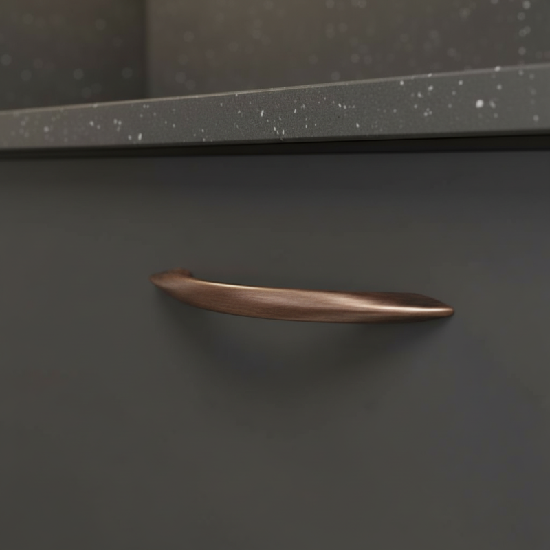 Dunkles Kupfer vereint modernen Industrie-Look mit warmer Eleganz. Der Griff KINGSTON in dieser Ausführung verleiht dem Möbel Charakter und Raffinesse, wirkt zugleich zeitlos und lässt sich leicht mit einer breiten Farb- und Materialpalette kombinieren.