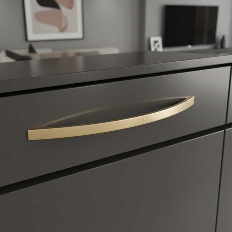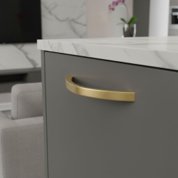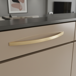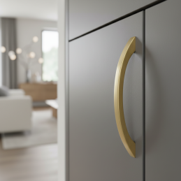 Eleganter und zeitloser Griff EMILIO in gebürsteter Goldausführung ist das perfekte Accessoire für moderne und klassische Möbel. Seine sanft geschwungene Form wirkt luxuriös und gleichzeitig ergonomisch – liegt angenehm in der Hand und verleiht den Möbeln einen stilvollen Akzent.