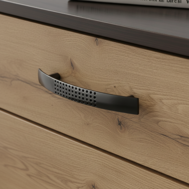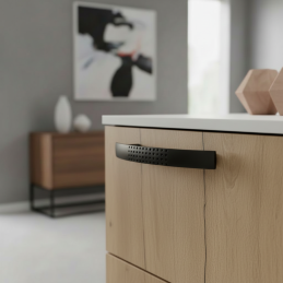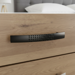 Der Griff VELLEN in eleganter schwarzer, matter Ausführung bringt einen markanten, modernen Akzent, der sowohl für minimalistische, industrielle als auch trendige Innenräume geeignet ist. Die sanft gebogene Form zusammen mit der dekorativen, gepunkteten Struktur sorgt für angenehme Handhabung und ein attraktives Aussehen an jedem Möbelstück.
