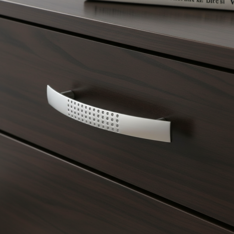 Der Griff VELLEN im eleganten matten Chrom-Design vereint modernes Aussehen, sanfte Krümmung und eine dekorative Struktur aus kleinen Punkten, die den Griff verbessern und ihm einen besonderen Stil verleihen. Die ideale Wahl für Küchen, Bäder und moderne Möbel im Haushalt.