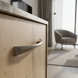 Der Griff SIMPLO in gebürsteter Nickel-Ausführung ist eine ausgezeichnete Wahl für alle Arten moderner Möbel. Seine leicht gebogene Form wirkt elegant und zeitlos, während gebürstetes Nickel ein angenehmes mattes Aussehen und eine universelle Kombinierbarkeit mit jedem Dekor bietet.