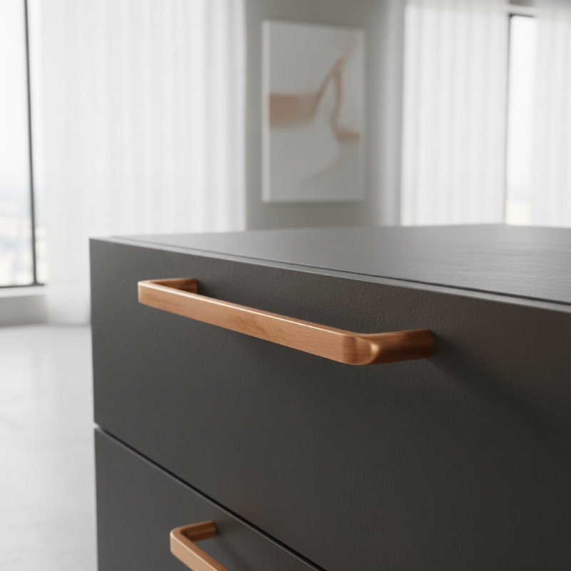 Stilvoller Griff BRISA in der Oberfläche Kupfer ist ein außergewöhnliches Design-Accessoire für Möbel im modernen, industriellen und Vintage-Stil. Der warme Kupferton verleiht Schränken oder Kommoden einen einzigartigen Charakter und einen interessanten visuellen Akzent, der auf dunklem Holz, schwarzen Möbeln und hellen Flächen wunderschön zur Geltung kommt.