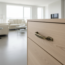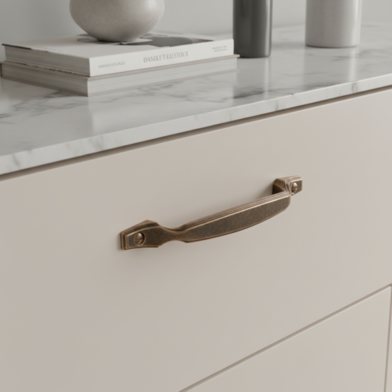 Der Griff CANDACE in der Ausführung Altmessing vereint klassische Formgebung mit edlem Vintage-Look. Die sanft geschwungenen Linien und dekorativen Enddetails wirken handwerklich und zeitlos, während die Oberfläche in Altmessing einen angenehmen, warmen und authentisch patinierten Effekt verleiht.