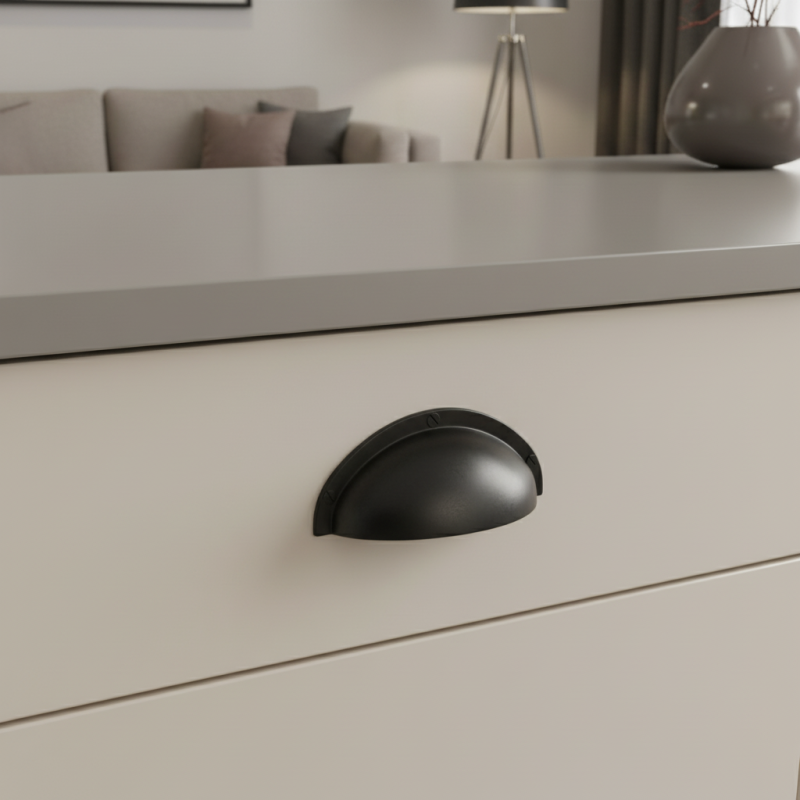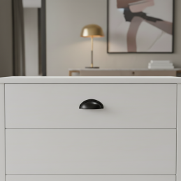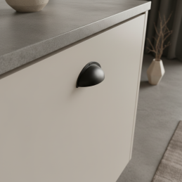Griff ZENA in der Ausführung schwarz matt kombiniert die traditionelle Muschelform eines Griffs mit einem modernen, minimalistischen Look. Das halbrunde Design sorgt für einen bequemen Griff, während die matte schwarze Oberfläche dem Möbelstück einen markanten, eleganten und zugleich zeitlosen Akzent verleiht.