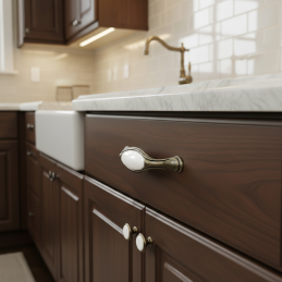 Der Griff RITA in der Oberflächenbehandlung Altgold ist ein zeitloses dekoratives Element, das klassische, ländliche und romantische Innenräume perfekt ergänzt. Seine Form ist in einem dezent historisierenden Stil gehalten und der mittlere Teil aus glänzendem weißem Porzellan verleiht dem Griff ein luxuriöses und sauberes Aussehen.