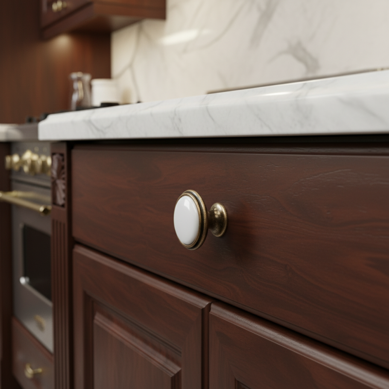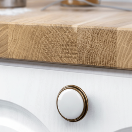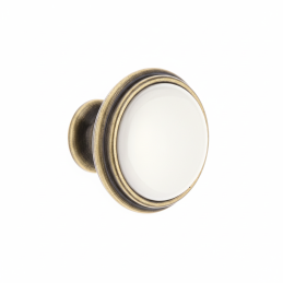 Der Knopf RITA in der Oberfläche Altgold ist ein wunderschönes Accessoire für klassische, ländliche und romantische Interieurs. Er kombiniert die traditionelle Metallform mit einer mittigen Porzellaneinlage in Weiß, die dem Knopf ein zartes, luxuriöses und sauberes Aussehen verleiht.