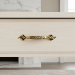 Der elegante Möbelgriff KAMILA in der Ausführung Altmessing ist ein stilvolles Accessoire für klassische, rustikale und Vintage-Möbel. Die dekorativen Details und die dezent patinierte Oberfläche verleihen den Möbeln einen luxuriösen und zeitlosen Charakter.