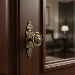 Der dekorative Griff VENICE im opulenten Vintage-Stil ist ein markantes Element für klassische, rustikale oder romantisch gestaltete Möbel. Die Kombination aus einer verzierten Unterlegscheibe und einem detailreich gearbeiteten runden Knopf sorgt für ein elegantes und luxuriöses Erscheinungsbild.