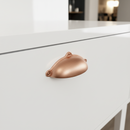 Der Griff MELANIE in elegantem Kupferdesign ist ein außergewöhnliches Designelement, das Ihren Möbeln ein warmes, stilvolles und zeitloses Aussehen verleiht. Die abgerundete „Schalen“-Form des Griffs sorgt für ein angenehmes Greifen und bringt gleichzeitig einen dezenten Retro-Touch, der im Kupferton zu einem markanten dekorativen Element wird.