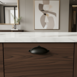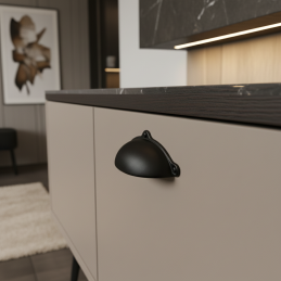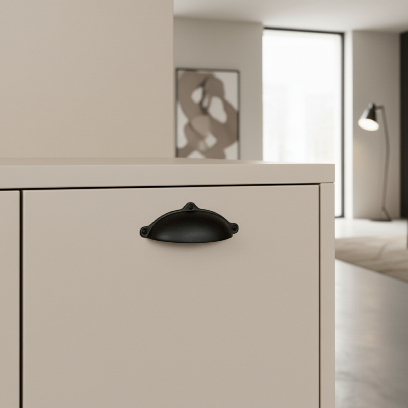 Der Griff MELANIE in modernem mattschwarzem Design ist ein elegantes und zeitloses Accessoire für Kommoden, Schränke, Küchenmöbel oder Schubladen. Seine ikonische „Schalen“-Form bietet einen besonders bequemen Griff und verleiht den Möbeln gleichzeitig einen stilvollen Retro-Touch, der in mattem Schwarz besonders modern und raffiniert wirkt.