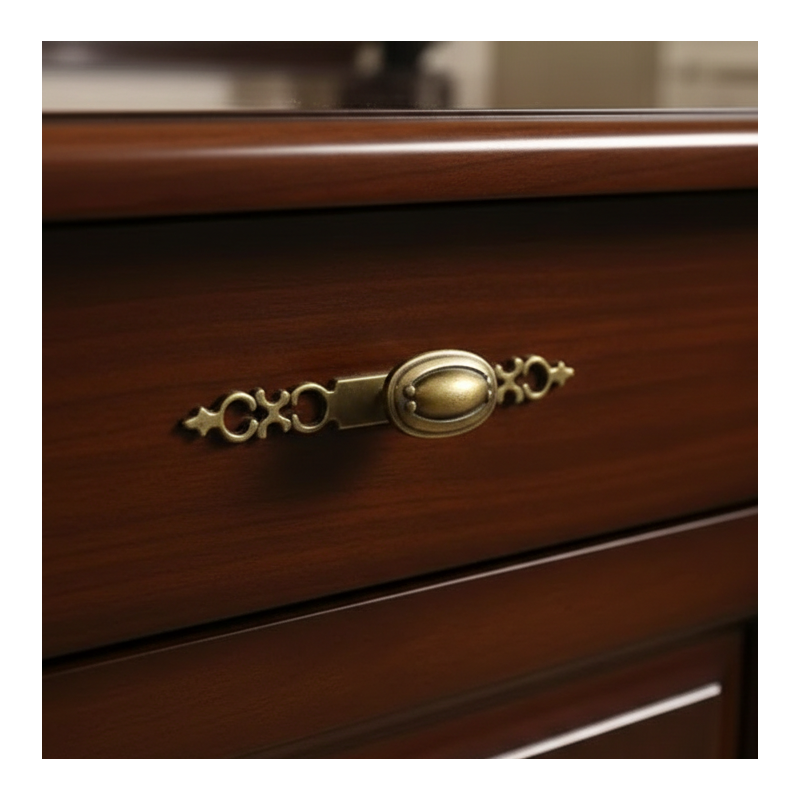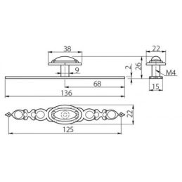 Der dekorative Griff FLORENCE im Vintage-Stil ist ein markantes Designelement, das sich für rustikale, klassische und romantisch gestaltete Möbel eignet. Die Kombination aus einer verzierten Unterlage und einem eleganten ovalen Knopf sorgt für ein luxuriöses und zeitloses Erscheinungsbild.