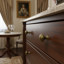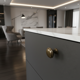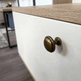 Eleganter klassischer Knopf aus der Kollektion ARLES in der Oberflächenbehandlung Messing Patina glänzend. Er eignet sich für rustikale, Vintage- und Landhausmöbel und ergänzt dank seiner zeitlosen Form wunderschön Kommoden, Schränkchen oder Küchenzeilen. Der massive Metallkörper garantiert eine lange Lebensdauer und ein angenehmes Greifen.