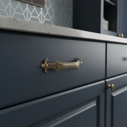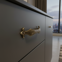 Der Griff VERDI in der Oberfläche Altmessing bringt Noblesse, traditionellen Stil und handwerkliche Ästhetik ins Interieur. Reichhaltige Reliefmuster, verzierte Konturen und die charakteristische Form verweisen auf ein historisches Design, das den Möbeln ein einzigartiges und luxuriöses Aussehen verleiht.