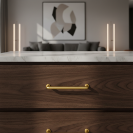 Der Griff NURIA in der Ausführung gebürstetes Gold verleiht dem Interieur einen luxuriösen und zugleich modernen Ausdruck. Seine glatten, abgerundeten Linien, ergänzt durch dezente Ringe an den Enden, wirken raffiniert und zeitlos. Gebürstetes Gold erzeugt einen eleganten, warmen Farbton, der perfekt zu weißen, dunklen und natürlichen Möbeln passt.