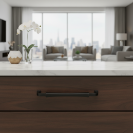 Der Griff NEUS in der Ausführung schwarz matt bringt einen modernen, mutigen und dennoch eleganten Ausdruck ins Interieur. Sein sanft gebogenes Gehäuse und die charakteristisch geformten Enden wirken zeitlos, doch in schwarzer matter Farbe erhält der Griff einen deutlich zeitgemäßen bis industriellen Charakter. Diese Oberfläche bildet einen schönen Kontrast zu hellen Türen und Naturholz und verleiht den Möbeln einen hochwertigen, designorientierten Akzent.
