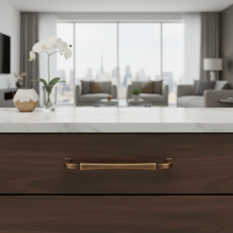 Der Griff ist ergonomisch gestaltet, um angenehm in der Hand zu liegen, was ihn zu einer praktischen Lösung für Schubladen und Türen von Küchen- oder Systemmöbeln macht. NEUS harmoniert hervorragend mit Holz, dunklen Farbtönen und Interieurs mit traditionellen Details.
