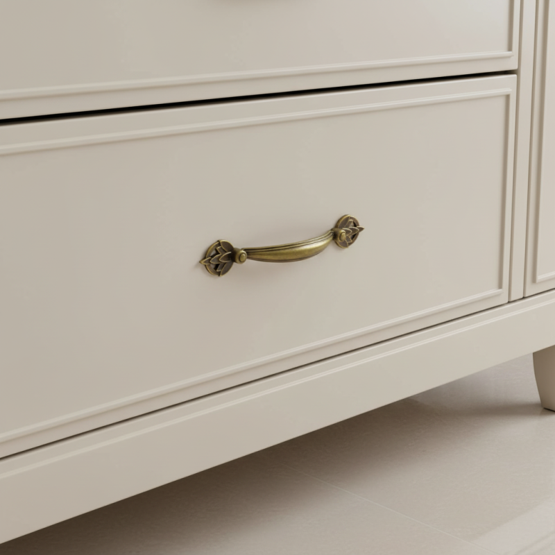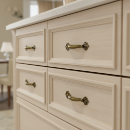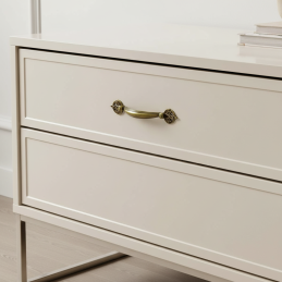 Dekorativer Griff CASANDRA in der Ausführung Altmessing ist das ideale Accessoire für klassische, rustikale oder Vintage-Möbel. Seine elegante Form mit dekorativen Endstücken erinnert an historische Handwerkskunst und verleiht dem Interieur einen edlen Charakter. Passt hervorragend zu Schubladen, Schränken, Kommoden und Vitrinen.