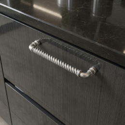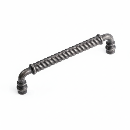 Rustikale Möbelgriff Griff ROXOR in der Oberflächenbehandlung Alt-Silber ist ein markantes dekoratives Element, das den Möbeln einen traditionellen und eleganten Charakter verleiht. Der typische gedrehte Körper des Griffs in Kombination mit der patinierten Optik erzeugt einen authentischen rustikalen Eindruck, ideal für ländliche, klassische oder historisch gestaltete Innenräume.