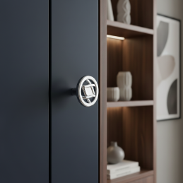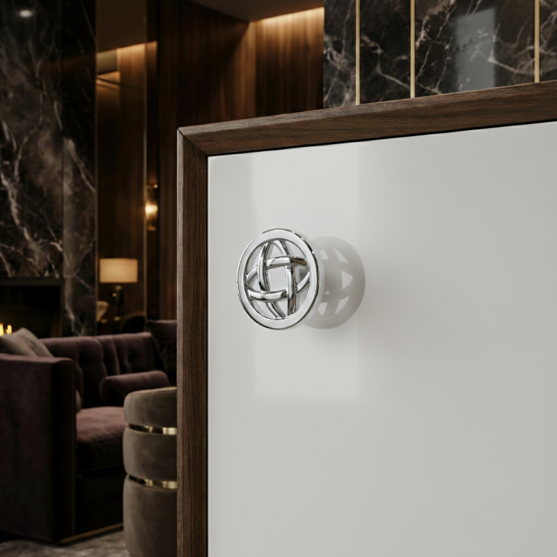 Der dekorative Knopf ALINA in glänzendem Chrom besticht durch ein feines, geflochtenes Muster, das den Möbeln ein elegantes und zugleich originelles Aussehen verleiht. Die glänzende Chromoberfläche wirkt modern und luxuriös, wodurch sie sowohl zu klassischen als auch zu modernen Interieurs passt.