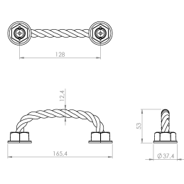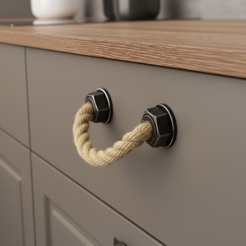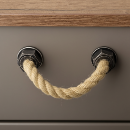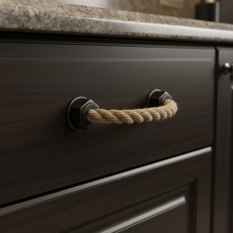 Der Griff SPACCATA in der Oberflächenbehandlung antikschwarz verbindet einen massiven geflochtenen Seilgriff mit dekorativen Kunststoff-Endkappen. Trotz des rustikalen Aussehens wirken die Endkappen optisch wie Metall, sind jedoch dank des Kunststoffmaterials leichter, rosten nicht und eignen sich auch für feuchtere Räume.