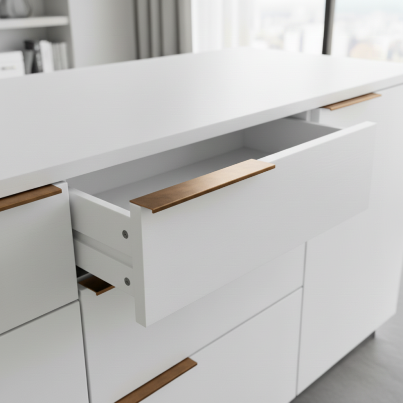 Der Griff wird von der Vorderseite an der Kante von Türen oder Schubladen montiert.