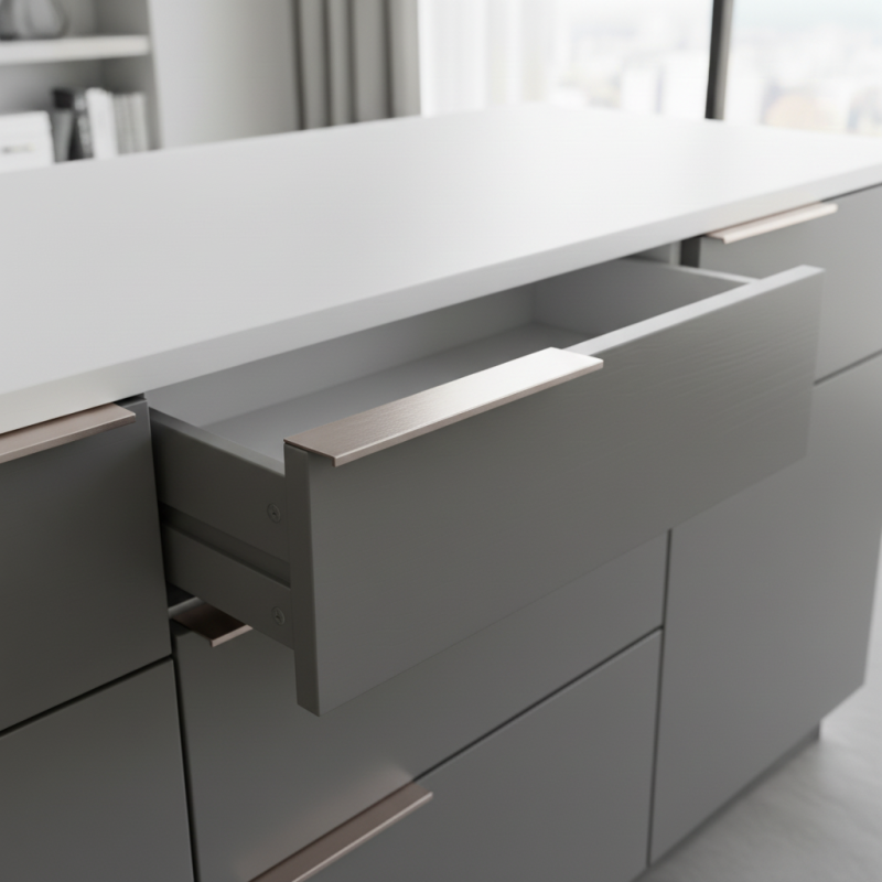 Die Griffleiste wird von der Vorderseite an der Kante von Türen oder Schubladen montiert.