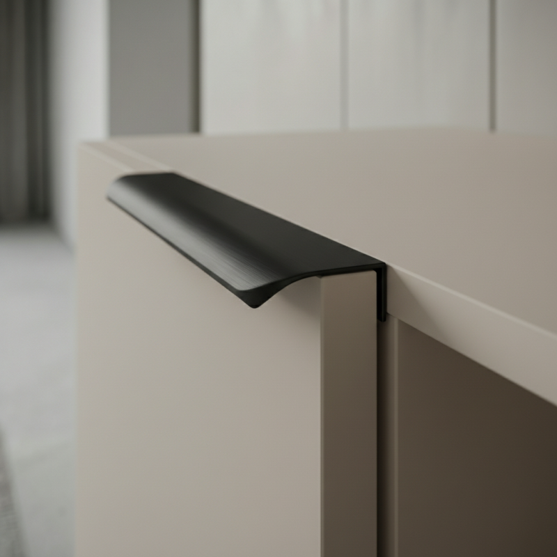 Der moderne Griff für die Türkante AVANTI in schwarzer, matter Ausführung ist ein stilvolles Accessoire für zeitgemäße Innenräume. Er wird an der oberen Kante von Türen oder Schubladen montiert und sorgt so für ein sauberes und minimalistisches Erscheinungsbild, ohne die Frontfläche des Möbels zu stören.