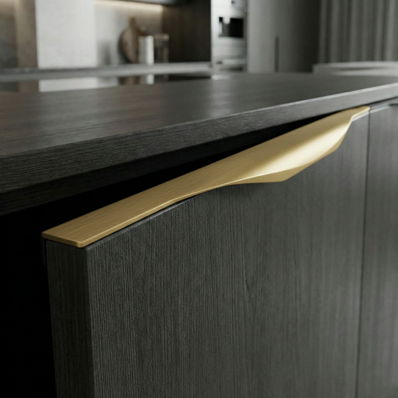 Der elegante Griff VULCANO in der Ausführung gebürstetes Messing ist eine stilvolle und zeitlose Lösung für moderne sowie klassische Innenräume. Er wird an der oberen Kante der Tür montiert und bewahrt so das saubere Erscheinungsbild des Möbels, ohne die Frontfläche zu stören.