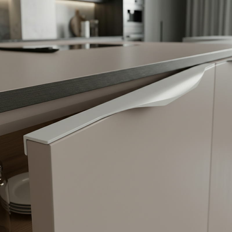 Moderner Griff, der an der Kante der Tür angebracht werden kann und somit den Effekt eines Fräsgriffs vermittelt, obwohl es sich um einen klassischen Griff handelt