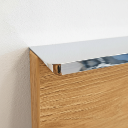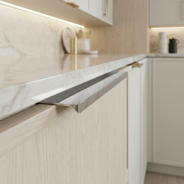 Der Griff PADOVA in der Ausführung glänzendes Chrom ist eine elegante Ergänzung für moderne und zeitlose Innenräume. Er wird an der oberen Kante der Tür montiert, wodurch das Möbelstück ein sauberes Erscheinungsbild ohne Unterbrechung der Frontfläche behält.