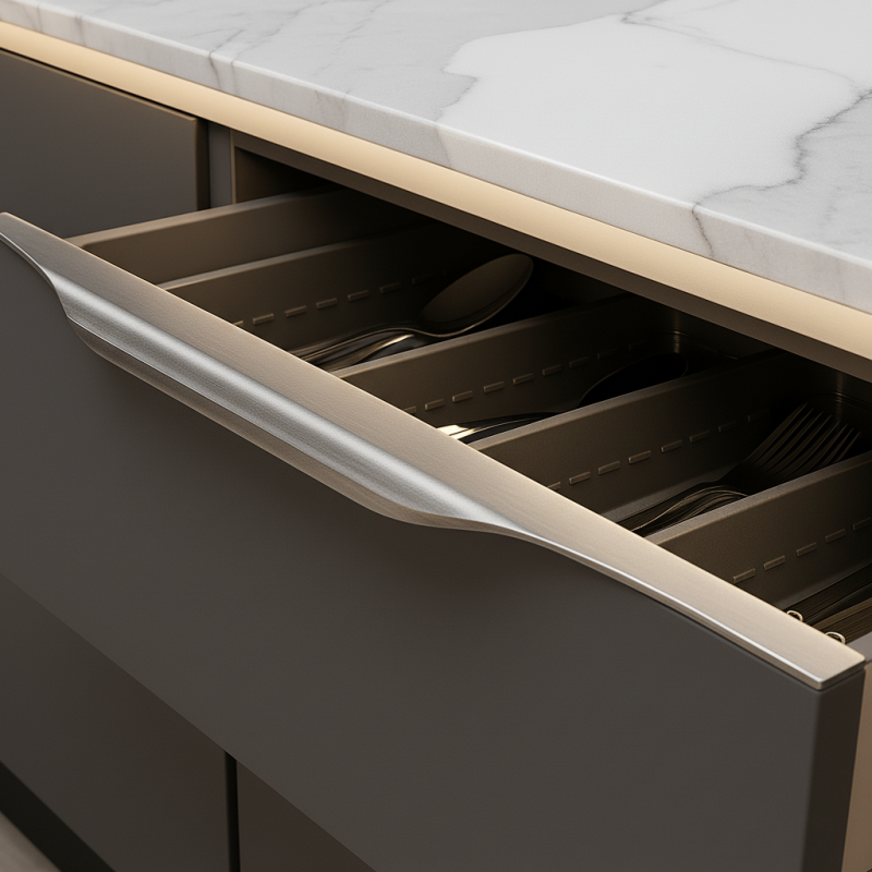 Moderne eingefräste Griffleiste LUTRA in der Ausführung Edelstahl ist die ideale Wahl für elegante und zeitlose Innenräume. Sie wird direkt in die Kante der Tür oder Schublade eingesetzt und schafft so ein sauberes, minimalistisches Erscheinungsbild ohne störende Elemente.
