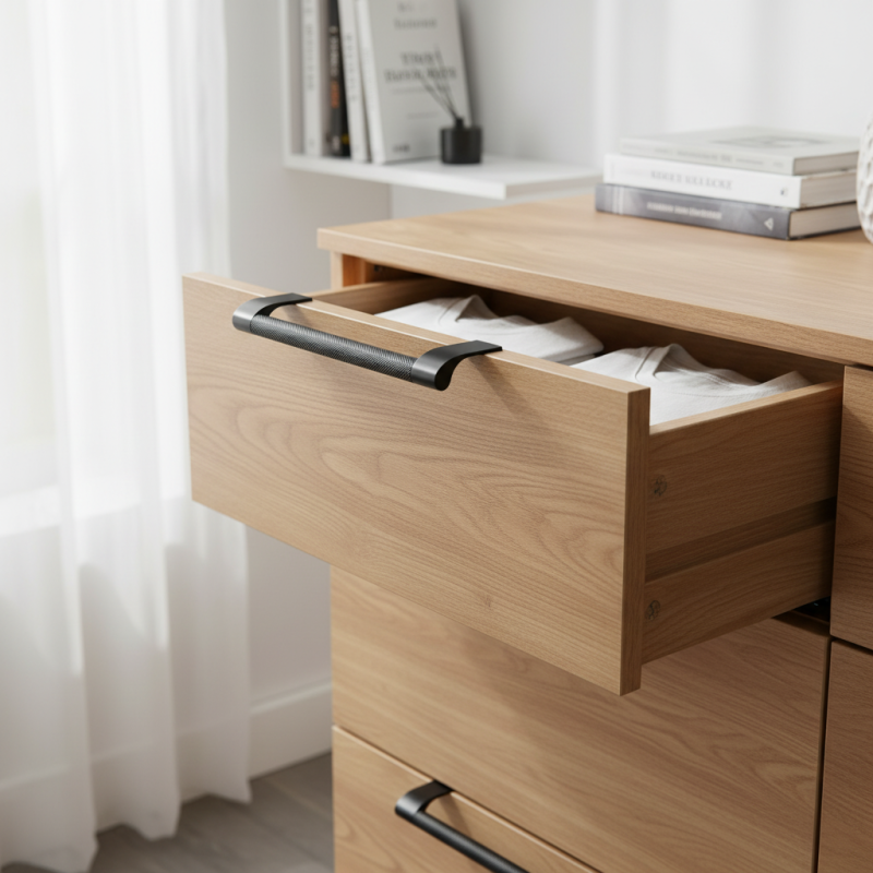 Das Design-Kantenprofil ATHENA in schwarzer, matter Ausführung verleiht ein modernes, elegantes und zugleich unauffälliges Aussehen, das für jedes Interieur geeignet ist. Es wird direkt an der oberen Kante der Tür oder Schublade montiert, wodurch es sehr minimalistisch und ergonomisch wirkt.