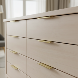 Moderner minimalistischer Griff CANSAS ist zur Montage an der Kante von Türen oder Schubladen bestimmt. Die elegante gebürstete goldene Oberfläche verleiht den Möbeln ein luxuriöses Aussehen, wirkt aber gleichzeitig dezent und zeitlos. Die ideale Wahl für moderne Küchenzeilen, Kleiderschränke, Badezimmerschränke oder Designermöbel.