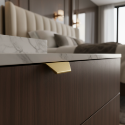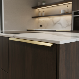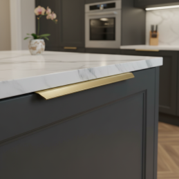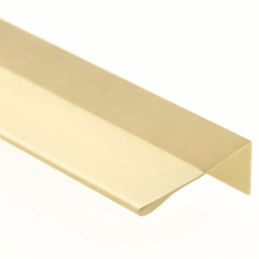 Eleganter Kanten-Griff MAURA in der Ausführung gebürstetes Gold ist eine moderne Lösung für ein klares und minimalistisches Möbeldesign. Er wird an der Oberkante der Tür montiert und schafft so ein dezentes, aber markantes Designdetail. Die gebürstete goldene Oberfläche verleiht dem Interieur einen luxuriösen und zeitlosen Charakter.