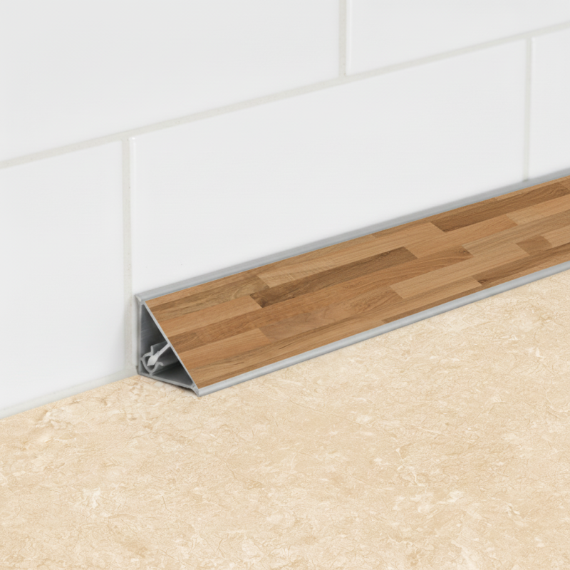Sie besteht aus zwei Teilen – der untere Teil wird verschraubt oder geklebt auf die Arbeitsplatte und der obere wird anschließend eingeklickt in den unteren Teil. So entsteht ein fester, präziser und harmonischer Abschluss im gleichen Dekor wie die Arbeitsplatte.