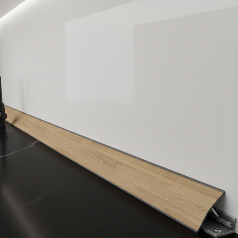 Sie besteht aus zwei Teilen – der untere Teil wird verschraubt oder geklebt auf die Arbeitsplatte und der obere wird anschließend eingeklickt in den unteren. Dadurch entsteht ein einheitlicher, ästhetischer und stabiler Abschluss im gleichen Dekor wie die Arbeitsplatte.