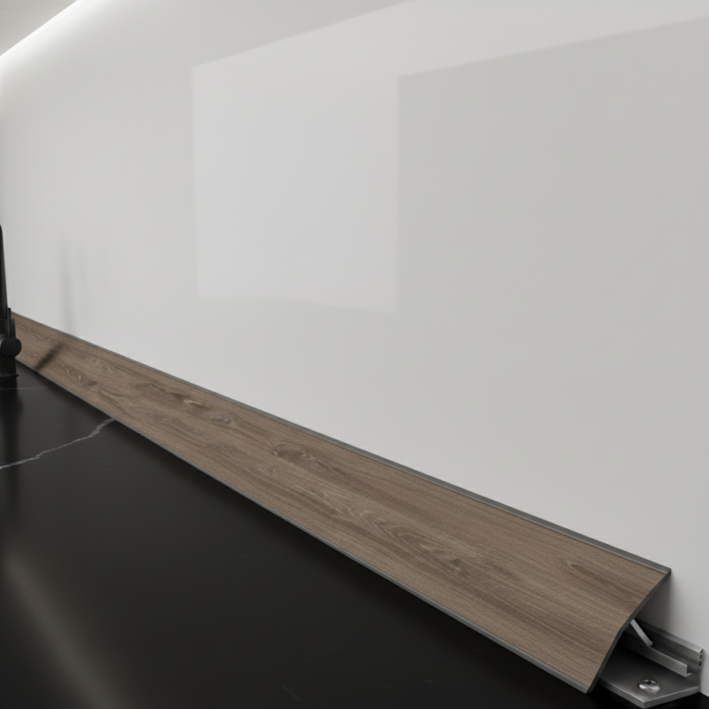 Sie besteht aus zwei Teilen – der untere Teil wird verschraubt oder geklebt auf die Platte und der obere wird anschließend eingeklickt in den unteren Teil, wodurch ein sauberes und ästhetisches Ende im gleichen Dekor wie die Arbeitsplatte entsteht.
