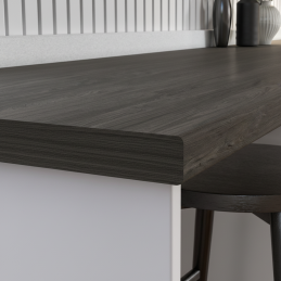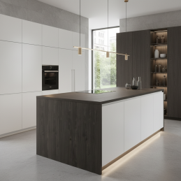 Dieses Dekor im Farbton dunkles Kohlenstoffholz mit feiner Struktur verleiht dem Raum Charakter und Kontrast, wobei es die Wärme des Holzes und einen luxuriösen Eindruck bewahrt.