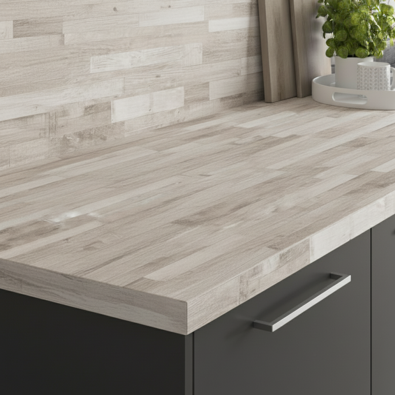 👉 KRONOSPAN Arbeitsplatte Linen Block Wood / K029 SU ist die ideale Wahl für alle, die ein natürliches, helles und modernes Dekor mit hoher Beständigkeit und langer Lebensdauer suchen – passt perfekt zu weißen, grauen und Holzküchen.