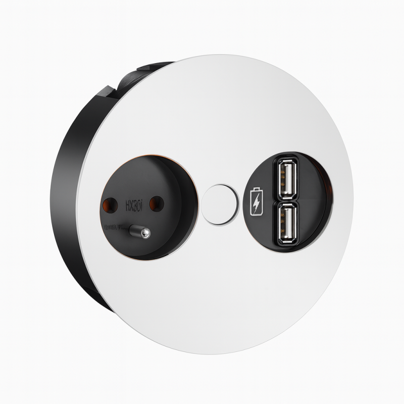 Exklusive Design-Steckdose von einem führenden europäischen Hersteller. Dank ihrer Tiefe ist sie auch für den Einbau in Oberschränke geeignet. Der sehr spektakuläre Verschluss der Löcher garantiert ein perfektes Aussehen, wenn sie nicht benutzt werden.