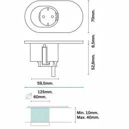 Die Steckdose ist für den Einbau in Möbel oder Arbeitsplatten vorgesehen. Dank der geringen Einbautiefe eignet sie sich auch für dünnere Materialien.