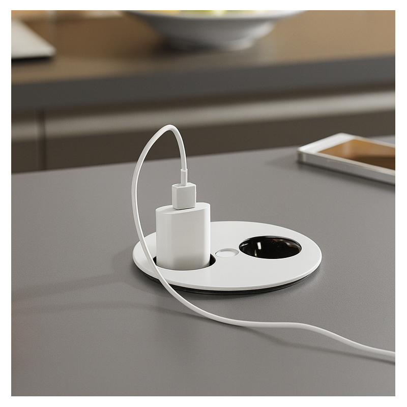 Die TWISTER-Steckdose ist eine moderne und platzsparende Lösung für Küchenschränke, Büroschreibtische oder Arbeitsflächen. Dank ihrer sehr geringen Einbautiefe lässt sie sich problemlos auch über Schubladen integrieren, die sie in keiner Weise stört.