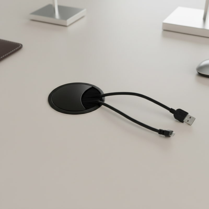 Die Durchführung besteht aus robustem Metall und ist mit einem drehbaren Deckel ausgestattet, der in 4 verschiedenen Positionen eingestellt werden kann. Dadurch können Sie die Öffnung einfach an die Kabelführung anpassen. Die Staubbürste schützt vor Verschmutzungen und sorgt gleichzeitig dafür, dass die Kabel fest an ihrem Platz bleiben.