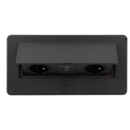 Das Öffnen der Steckdose ist einfach durch Knopfdruck, das Schließen erfolgt durch manuelles Zuklappen. Die obere Abdeckung besteht aus robustem Aluminium in schwarzer Ausführung, was eine lange Lebensdauer und ein modernes Aussehen garantiert.