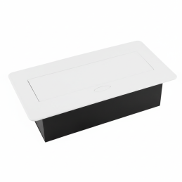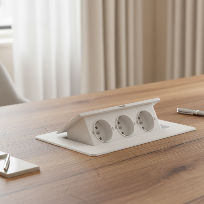 Moderne versenkbare Einbau-Steckdose zur Installation in einen Arbeitstisch oder Möbel (z. B. Wohnwand, Schreibtisch oder Kücheninsel in sicherem Abstand zur Spüle). Dank des Klappmechanismus lassen sich die Steckdosen einfach verstecken, wenn sie nicht verwendet werden, wodurch die Arbeitsfläche sauber und ästhetisch bleibt.