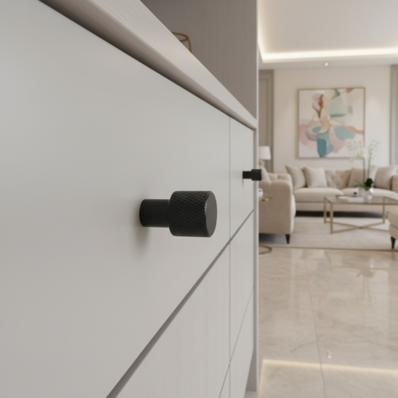 Der industrielle Griff INDUST I. in elegantem schwarzen, matten Design ist die perfekte Ergänzung für moderne, loftartige und minimalistische Innenräume. Die charakteristische gerändelte (knurled) Textur verleiht dem Griff ein originelles technisches Aussehen und verbessert gleichzeitig den Halt beim Öffnen von Türen oder Schubladen.