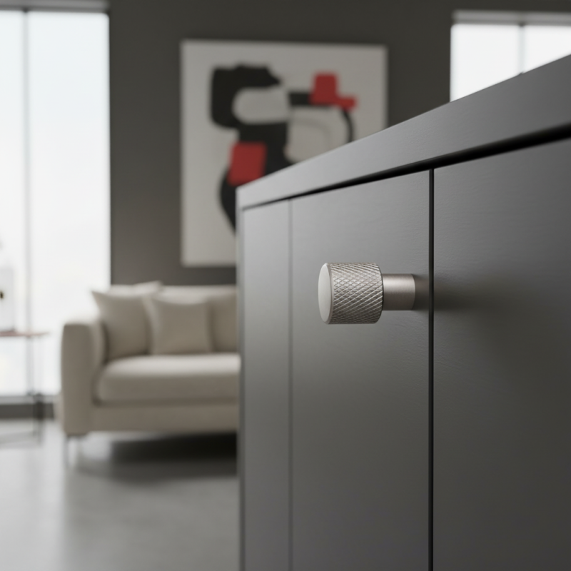 Der industrielle Griff INDUST I. in der Ausführung Edelstahl matt bringt modernen Industriestil in einem eleganten und zeitlosen satinierten Finish. Die charakteristische gerändelte (knurled) Oberfläche verleiht dem Griff ein technisches Aussehen, hervorragenden Halt und einen einzigartigen Designakzent.
