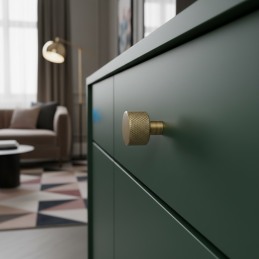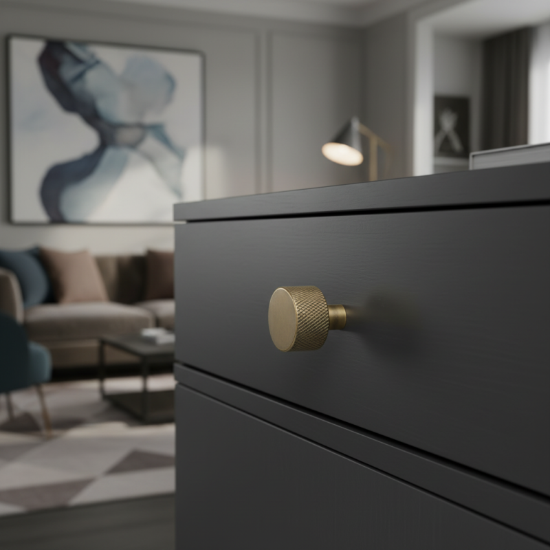 Die typische gerändelte (knurled) Textur unterstreicht den industriellen Stil und verbessert gleichzeitig den Griff beim Gebrauch. Die Ausführung in Altgold wirkt warm, zeitlos und kommt sowohl auf dunklen als auch auf hellen Möbeldekoren perfekt zur Geltung.
