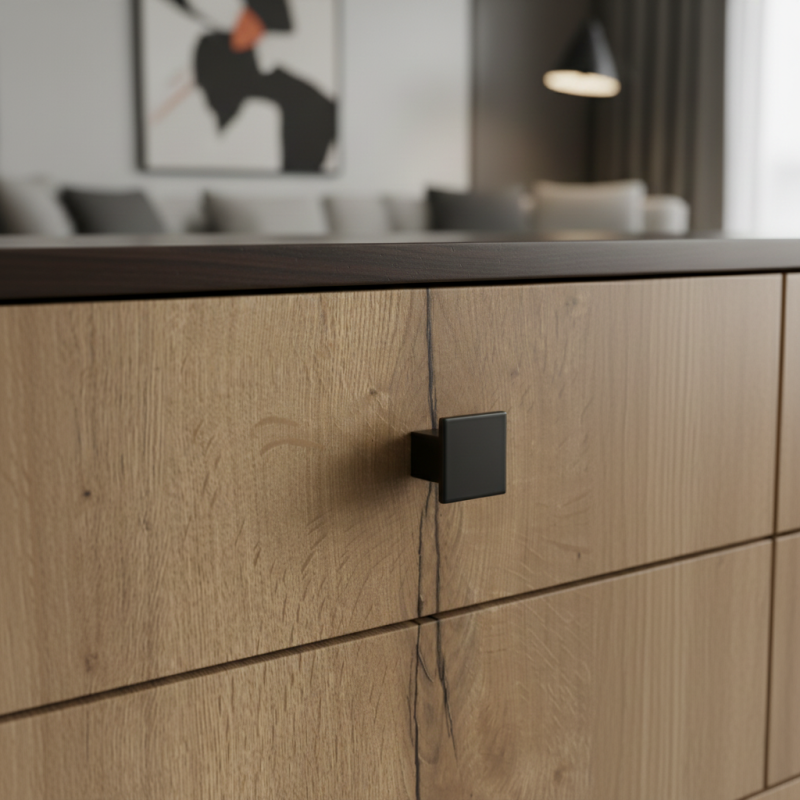 Knopfgriff AXON in elegantem mattschwarzem Design ist die ideale Wahl für ein modernes Interieur. Das minimalistische, eckige Design verleiht den Möbeln ein klares, zeitloses Aussehen und sorgt gleichzeitig für einen bequemen und zuverlässigen Griff. Dank der hochwertigen Verarbeitung eignet sich der Griff für Küchen, Bäder, Garderoben oder Büromöbel.