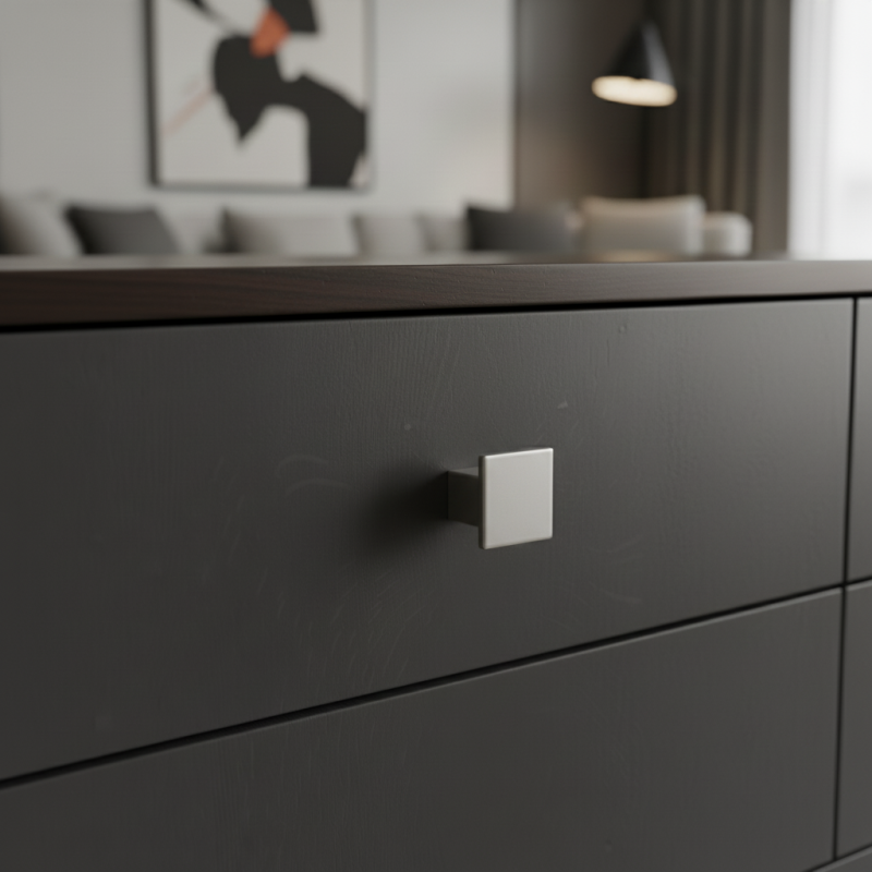 Knopfgriff AXON in matter Chromausführung ist das ideale Accessoire für moderne und minimalistische Innenräume. Seine klare, kantige Form wirkt elegant und gepflegt, während das matte Chrom einen dezenten technischen Look ohne Blendung verleiht. Dieser Griff eignet sich für Küche, Bad, Wohnzimmer und Büromöbel und bietet eine praktische und stilvolle Lösung für den täglichen Gebrauch.